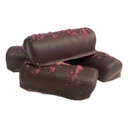 Eine zarte Schnittpraline mit einer Schicht Passionsfrucht-Himbeer Gelee auf einer dunklen Ganache aus Venezuela-Schokolade. Überzogen mit dunkler Schokolade. 11 Stück im Klarsichtbeutel.